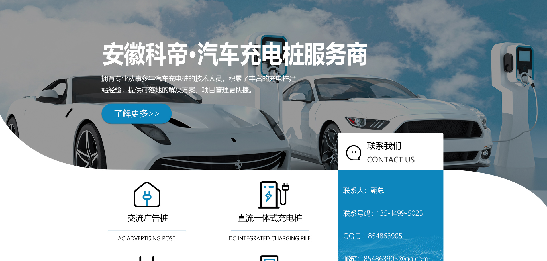 關(guān)于我們安徽科帝新能源科技有限公司坐落于安徽省會(huì)-合肥,是一家研發(fā)、生產(chǎn)智能充電樁設(shè)備,汽車充電站后臺監(jiān)控管理系統(tǒng)和生產(chǎn)高壓開關(guān)設(shè)備的企業(yè).由專門的研發(fā)團(tuán)隊(duì)、管理團(tuán)隊(duì)按照現(xiàn)代化企業(yè)制度規(guī)范設(shè)立的有限責(zé)任公司。致力于為能源智能、安全的應(yīng)用和節(jié)能減排提供整體的技術(shù)與產(chǎn)品解決方案。科帝集研發(fā)、設(shè)計(jì)、生產(chǎn)、銷售以及服務(wù)于一體,在電動(dòng)汽車充電方案,充電設(shè)施建設(shè)和城市配電方面擁有廣泛的技術(shù)研究及經(jīng)驗(yàn)積累,為客戶提供安全、智能的充電設(shè)備及充電運(yùn)營站建設(shè)一體化解決方案。并堅(jiān)持以人為本、質(zhì)量為先、顧客至上、不斷創(chuàng)新”的企業(yè)理念,為能源行業(yè)的發(fā)展、節(jié)能減排做出重大的貢獻(xiàn)。公司擁有豐富的產(chǎn)品種類,目前科帝已研發(fā)生產(chǎn)了三十多種產(chǎn)品,充電設(shè)備有直流一體式充電樁、直流分體式充電樁、直流廣告樁、交流廣告樁、廣告一體樁、壁掛交直流樁;等多種充電設(shè)備;每一款產(chǎn)品都是精心打造,力求為客戶提供優(yōu)越的用戶體驗(yàn)。展望未來科帝將通過持續(xù)的自...